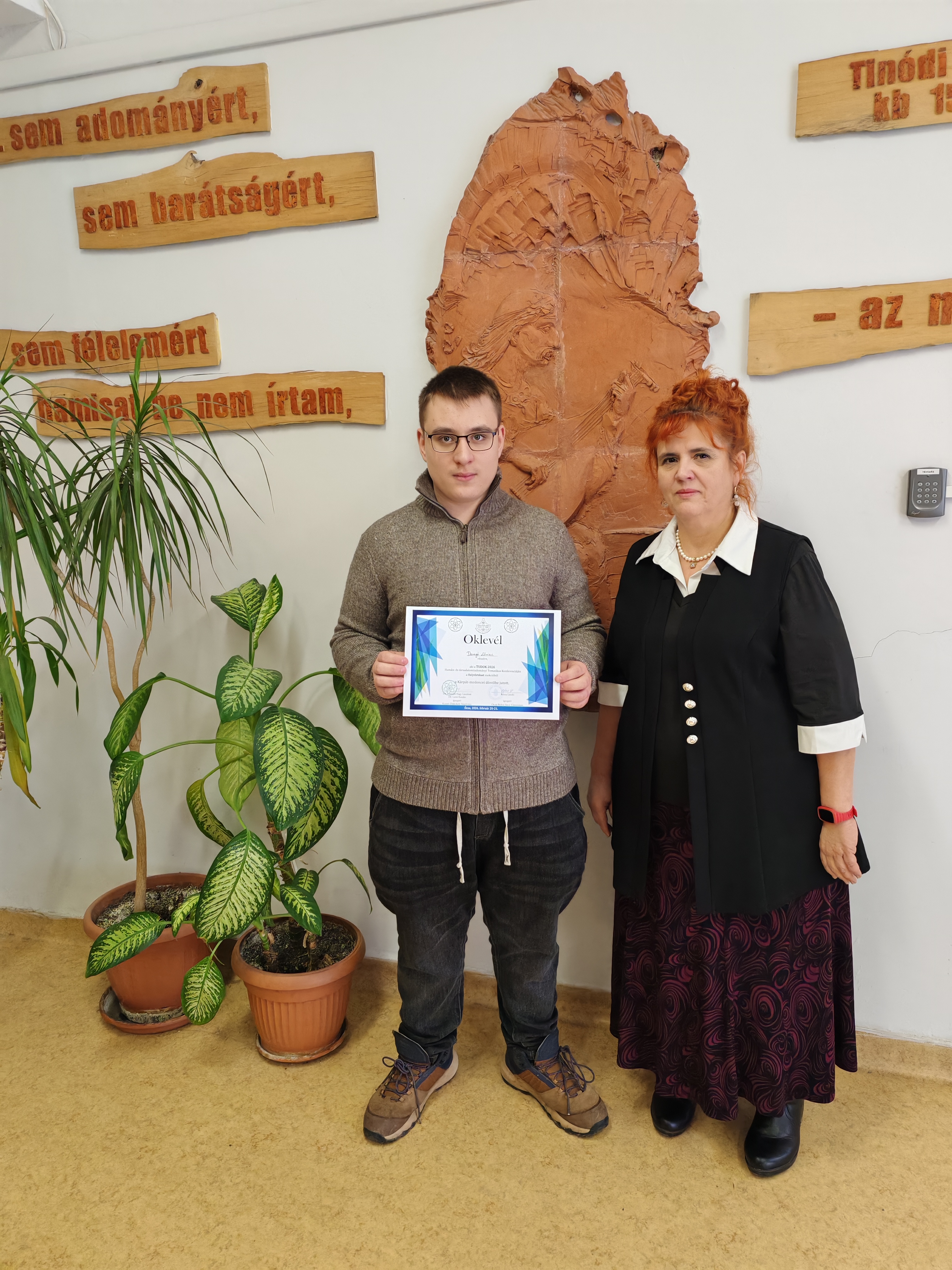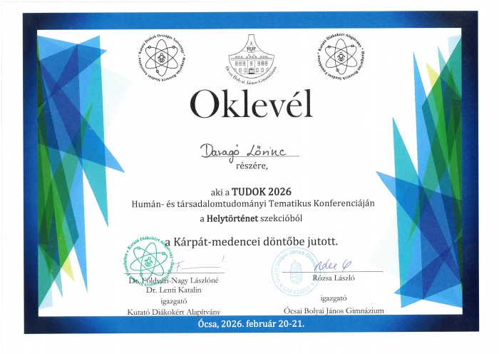 Daragó Lőrinc (8.a) osztályos diák, február 20-21-én megrendezett Tudományos Diákkörök XXVI. Kárpát-medencei Konferenciájának Humán- és társadalomtudományi Tematikus Konferenciája, amelyen Daragó Lőrinc 8.a osztályos tanulónk -maga mögött hagyva a középiskolásokat- a helytörténeti szekcióban bemutatott munkájával bejutott a Kárpát-medencei döntőbe.